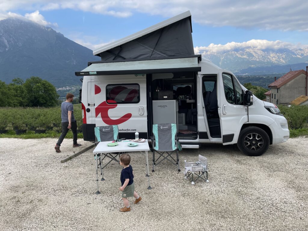 Avec un enfant en bas âge, le nôtre avait 16 mois lors de notre voyage, je dirai que c’est plus simple d’avoir une base, un endroit fixe. Surtout si le temps est mauvais. Car à cet âge et sachant marcher déjà depuis un moment, il n’a qu’une envie c’est d’explorer alors on se sent vite à l’étroit dans le van. Avec un bébé qui ne marche pas ça doit être plus simple. L’appartement c’était donc très sympa, surtout avec la pépite que nous avions trouvé, un appart de ski situé dans une ferme, le paradis des petits de se réveiller et d’aller voir vaches, lapins, chevaux… et immense jardin avec une vue imprenable sur les sommets.